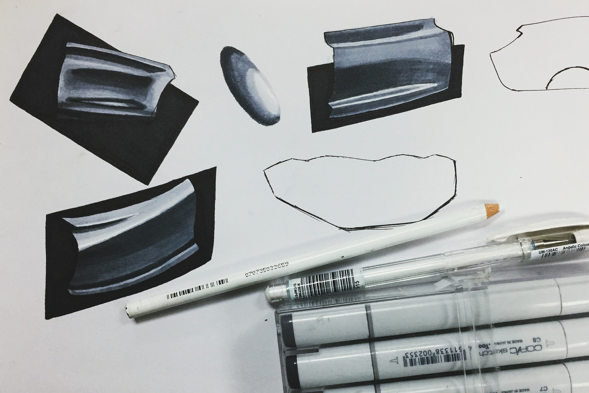 Inspired by Schumi Xu's form practice, these are hand-drawn to look realistic using markers, pens, and pencils